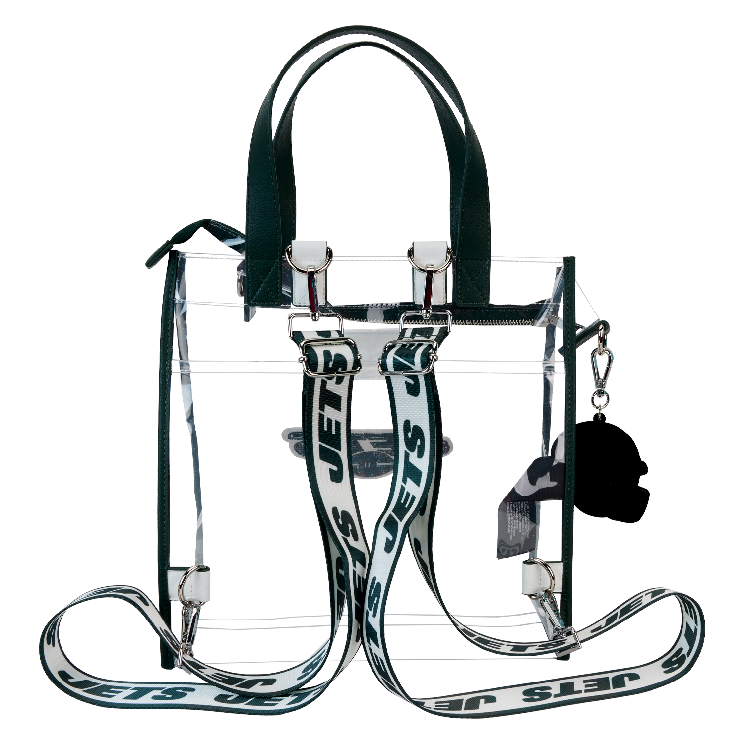 Feeling game-day ready? Cheer on your favorite football team with this convertible tote bag! The clear design makes it easy to bring your belongings into the stadium, and versatile shoulder straps help to keep your bag close as you wander the crowds. A chenille patch of the Jets logo, a helmet-shaped bag charm, and coordinating team colors give this bag an elevated look. No need to sacrifice your style at the big game – this accessory is the perfect combination of fashion and function.